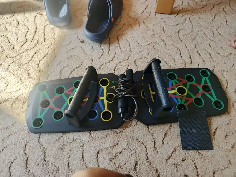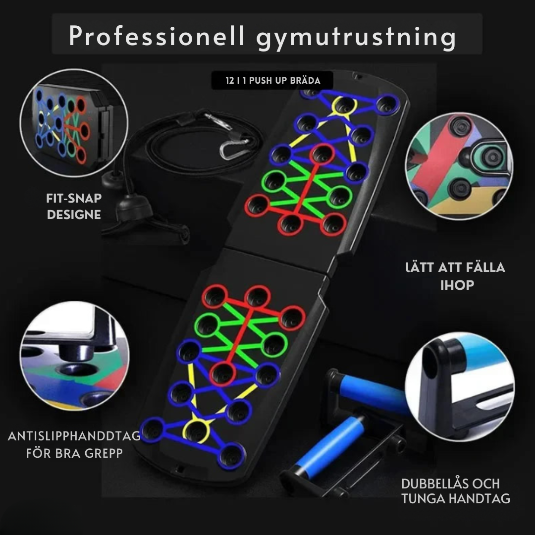 Setet inkluderar ett robust push-up bräde, halkfria handtag och spännband, vilket gör det till en komplett träningslösning för hemmet.